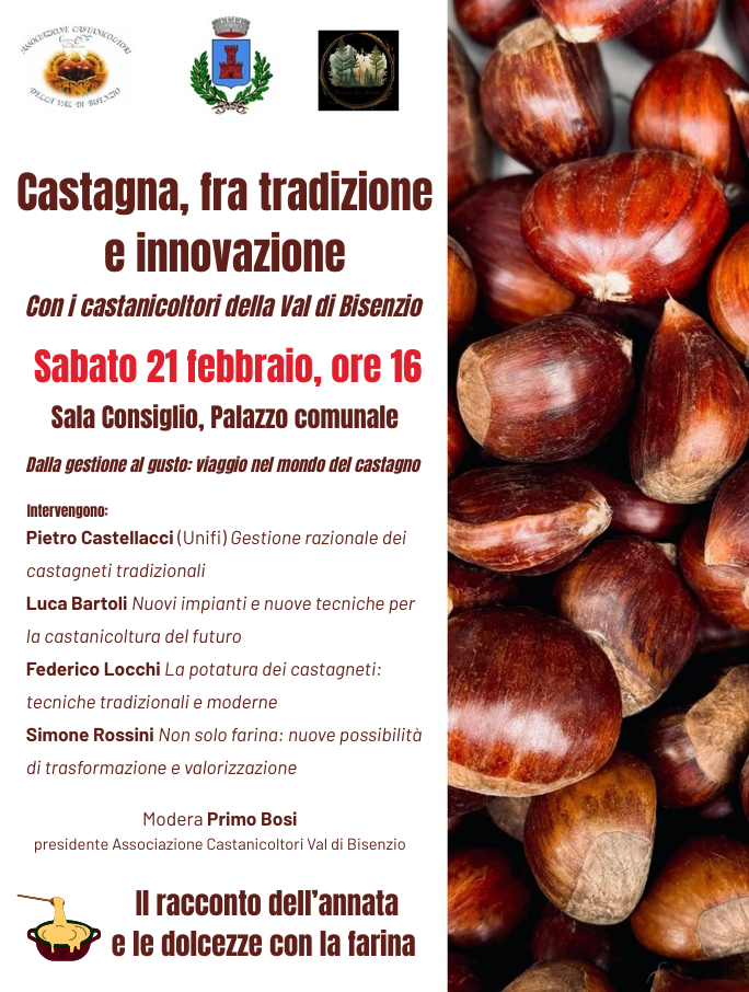 In apertura il convegno, un viaggio nel mondo del castagno, dalla gestione al gusto, di un valore della Val di Bisenzio. Dopo i saluti istituzionali si parte con gli interventi tecnici. Pietro Castellacci (Università di Firenze) con “Gestione razionale dei castagneti tradizionali”, poi Luca Bartoli con “Nuovi impianti e nuove tecniche per la castanicoltura del futuro”, Federico Locchi con “La potatura dei castagneti: tecniche tradizionali e moderne” e Simone Rossini con “Non solo farina: nuove possibilità di trasformazione e valorizzazione”. Modera il presidente dell’associazione Castanicoltori Primo Bosi.