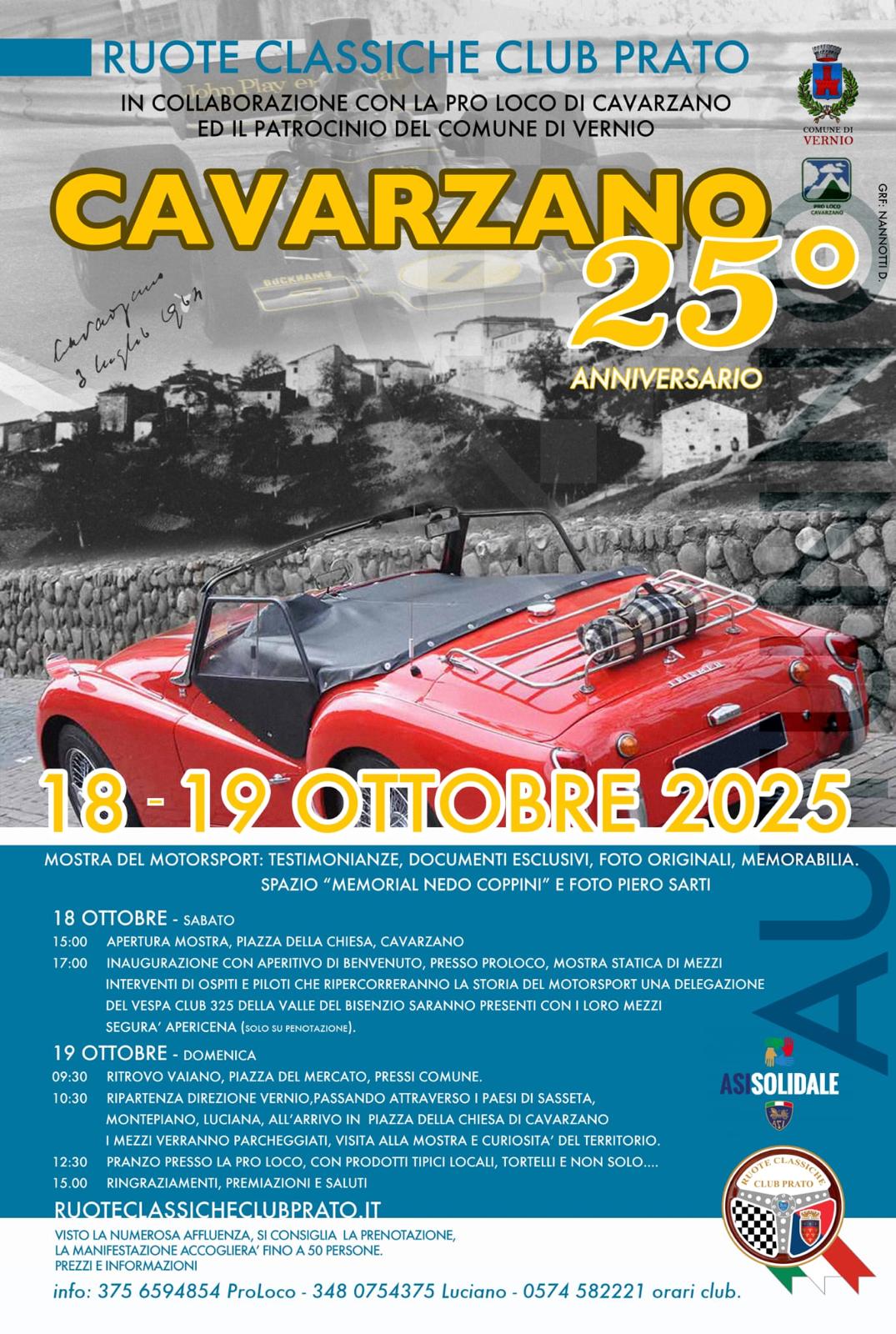 Arrivano le auto d’epoca a Cavarzano per celebrare i 25 anni del raduno organizzato dal club Ruote Classiche di Prato con una mostra in piazza della Chiesa, nella frazione del Comune di Vernio, in collaborazione con la Pro Loco di Cavarzano e con il patrocinio del Comune.