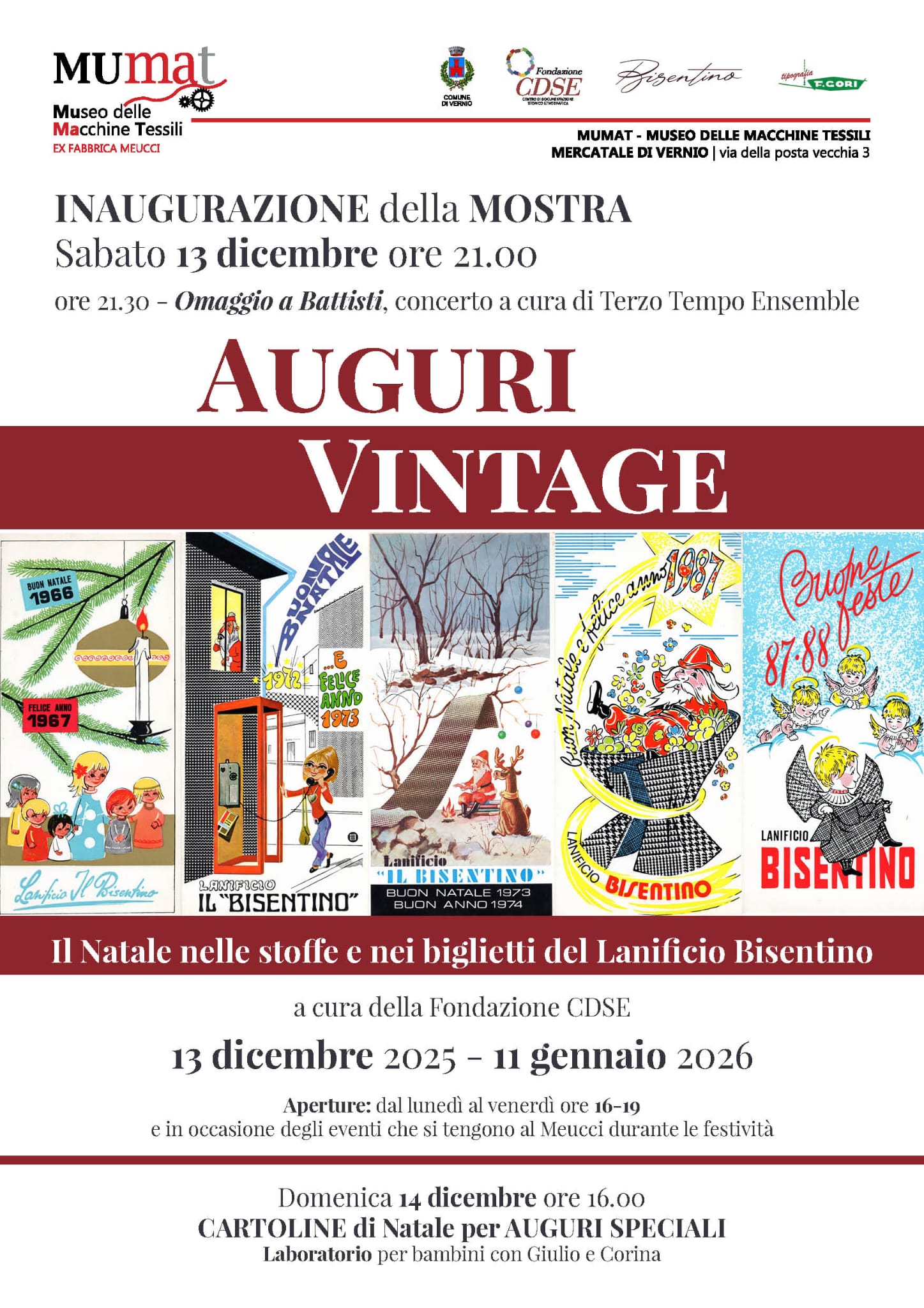 Promossa dal Comune di Vernio e realizzata dalla Fondazione CDSE la mostra “Auguri Vintage. Il Natale nelle stoffe e nei biglietti del Lanificio Bisentino”, si inaugura sabato 13 dicembre alle 21 (fino all’11 gennaio).