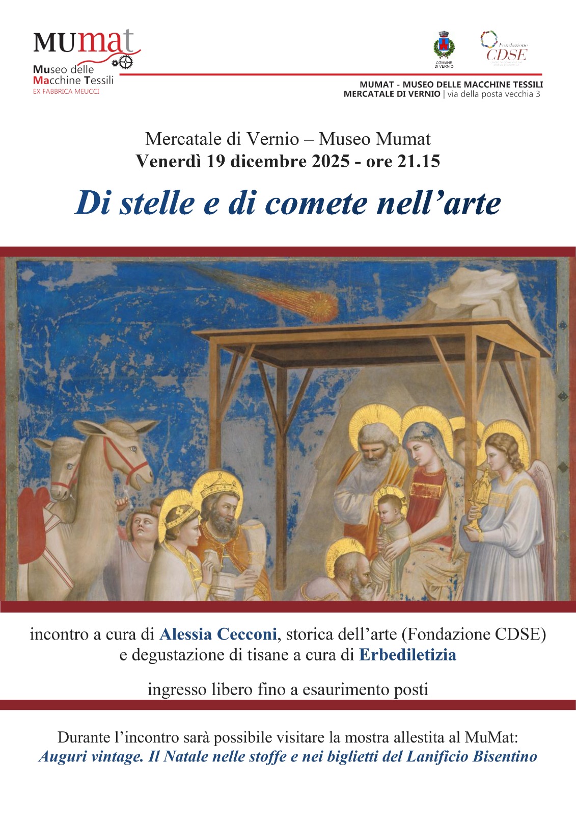 Venerdì 19 dicembre alle 21 Alessia Cecconi, storica dell'arte e direttrice della Fondazione CDSE, accompagnerà il pubblico in un meraviglioso viaggio nella storia dell'arte e nella raffigurazione delle stelle tra Medioevo e Rinascimento dal titolo "Di stelle e comete nell'arte". L’incontro sarà poi ‘riscaldato’ dalla degustazione di tisane natalizie a cura di Erbe di Letizia.