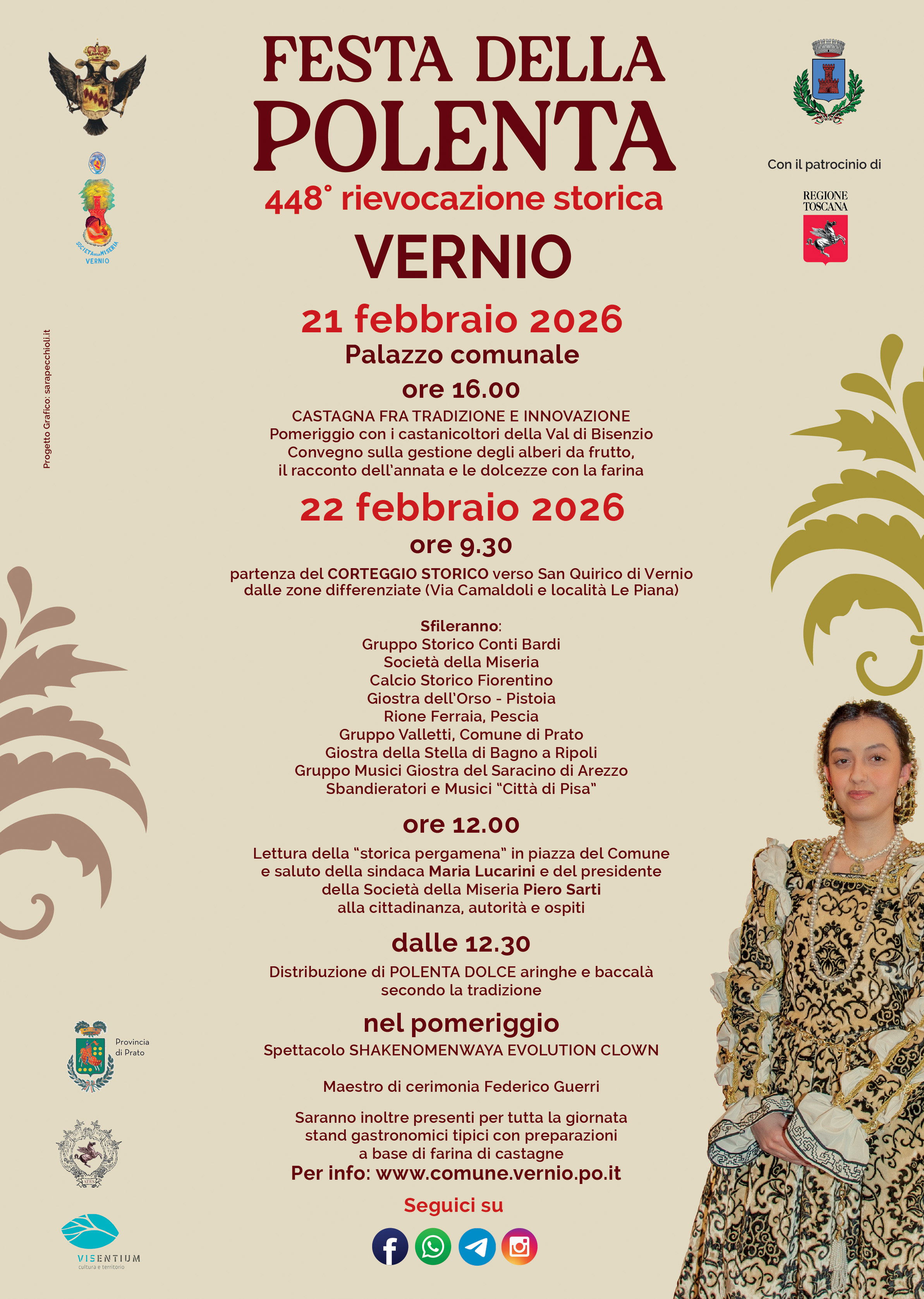 È tempo di rituffarsi nella storia per la contea di Vernio, tempo di sfilata con i meravigliosi abiti del gruppo storico Conti Bardi, tempo di rievocazione con la distribuzione del piatto della memoria, la polenta di farina di castagne accompagnata da aringa e baccalà. Insomma, sta per arrivare l’evento più atteso dell’anno, la 448esima edizione della Festa della Polenta è in programma per domenica 22 febbraio a partire dal primo mattino.