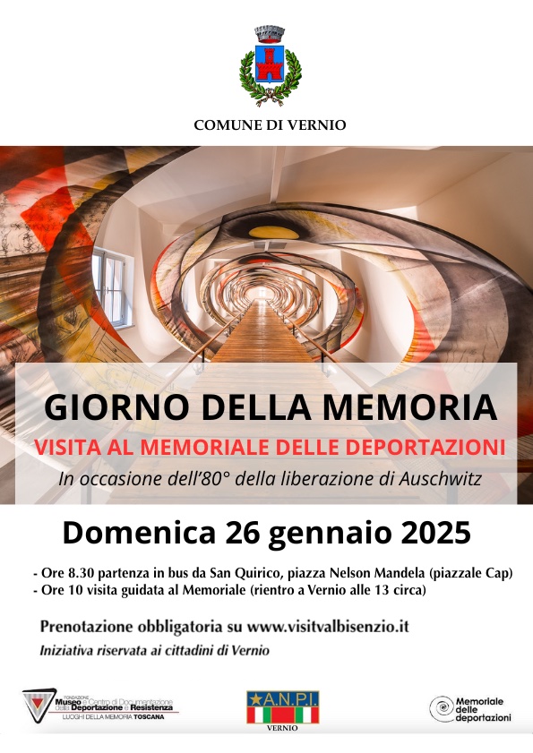 L’appuntamento è per domenica 26 gennaio. Prevede la partenza in bus alle 8.30 da San Quirico (piazza Nelson Mandela, il piazzale della Cap) alle 8.30, per arrivare a Firenze, al Memoriale (viale Giannotti 81/85), intorno alle 10. La visita guidata sarà condotta da Entico Iozzelli ed Elena Bresci del Museo della Deportazione. Dopo la visita si riparte per Vernio, sempre in bus. Il rientro è previsto verso le 13.