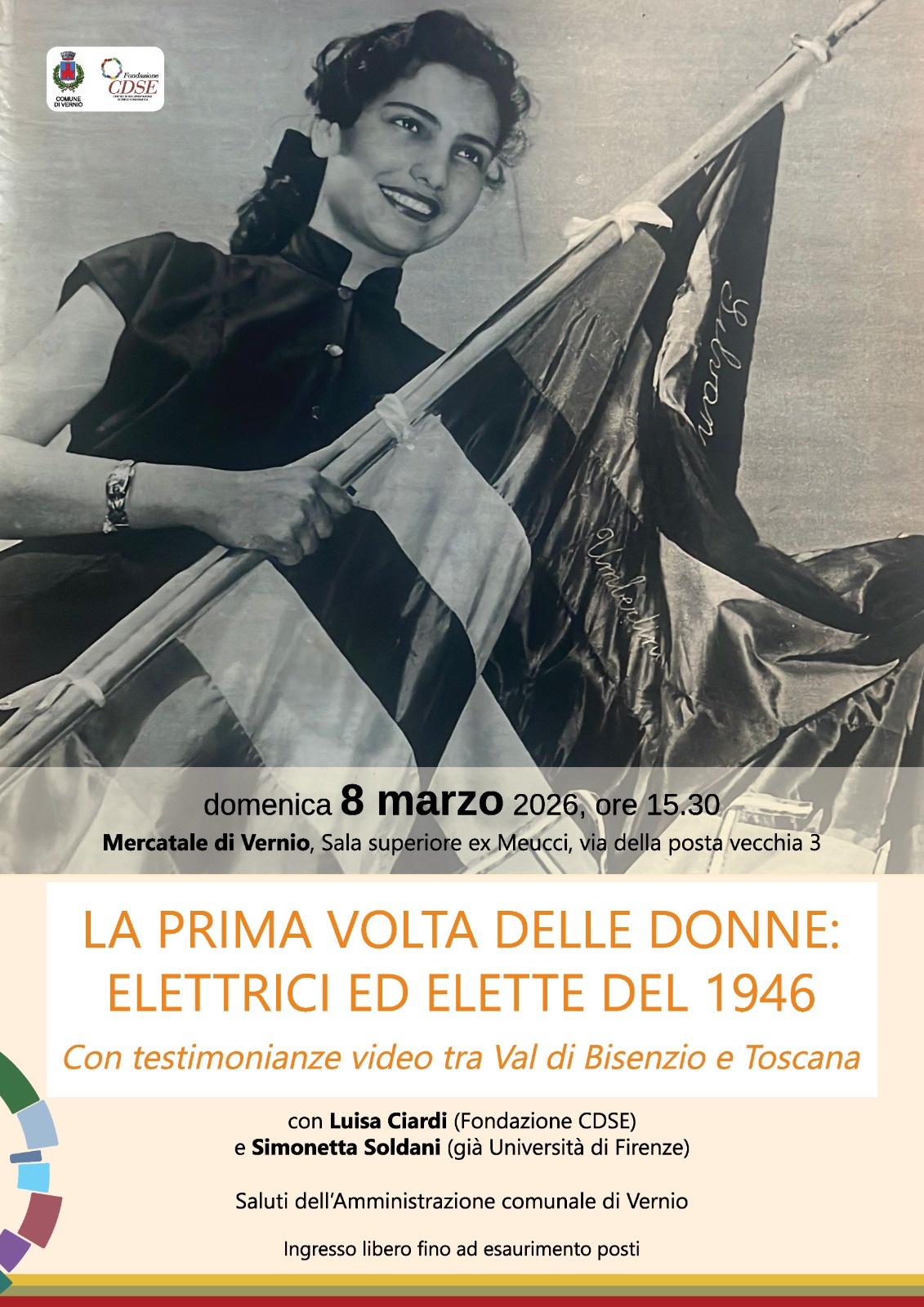 Donne elettrici, al voto per la prima volta, e donne elette. Sono passati 80 anni da allora, dal quel 1946 che fu fondamentale nel lungo cammino per i diritti e l’emancipazione femminile. E quest’anno l’8 marzo vuole essere anche un tributo a quella conquista. In occasione della Giornata Internazionale dei Diritti della Donna, infatti, il Comune di Vernio e la Fondazione CDSE organizzano l'incontro “La prima volta delle donne. Elettrici ed elette del 1946”, con interventi di Luisa Ciardi e della storica ed esperta nelle dinamiche legate al ruolo delle donne nella società italiana Simonetta Soldani.