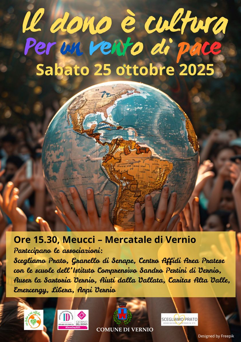 Vernio, 21 ottobre 2025 - “Il Dono è cultura – Per un vento di Pace” è il titolo dell’iniziativa promossa dal Comune di Vernio in occasione della Giornata del Dono, in programma sabato 25 ottobre alle ore 15.30 al Meucci a Mercatale. L’evento, organizzato in collaborazione con l’associazione Scegliamo Prato, che coordina il DonoDay 2025, rappresenta un importante momento di incontro e riflessione sul valore del dono come strumento di coesione e partecipazione civica.