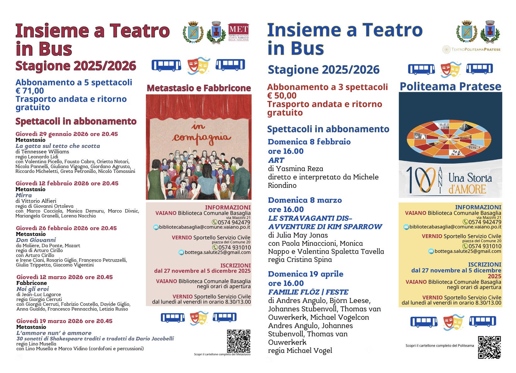 “Teatro in Bus” permette ai cittadini della Val di Bisenzio di raggiungere i teatri pratesi senza usare l’auto, grazie al servizio gratuito di trasporto andata e ritorno incluso nell’abbonamento. Anche per la stagione 2025/2026 le proposte sono due: l’abbonamento Metastasio–Fabbricone e l’abbonamento Politeama Pratese. Le iscrizioni saranno aperte da domani, giovedì 27 novembre, al 5 dicembre prossimo.
