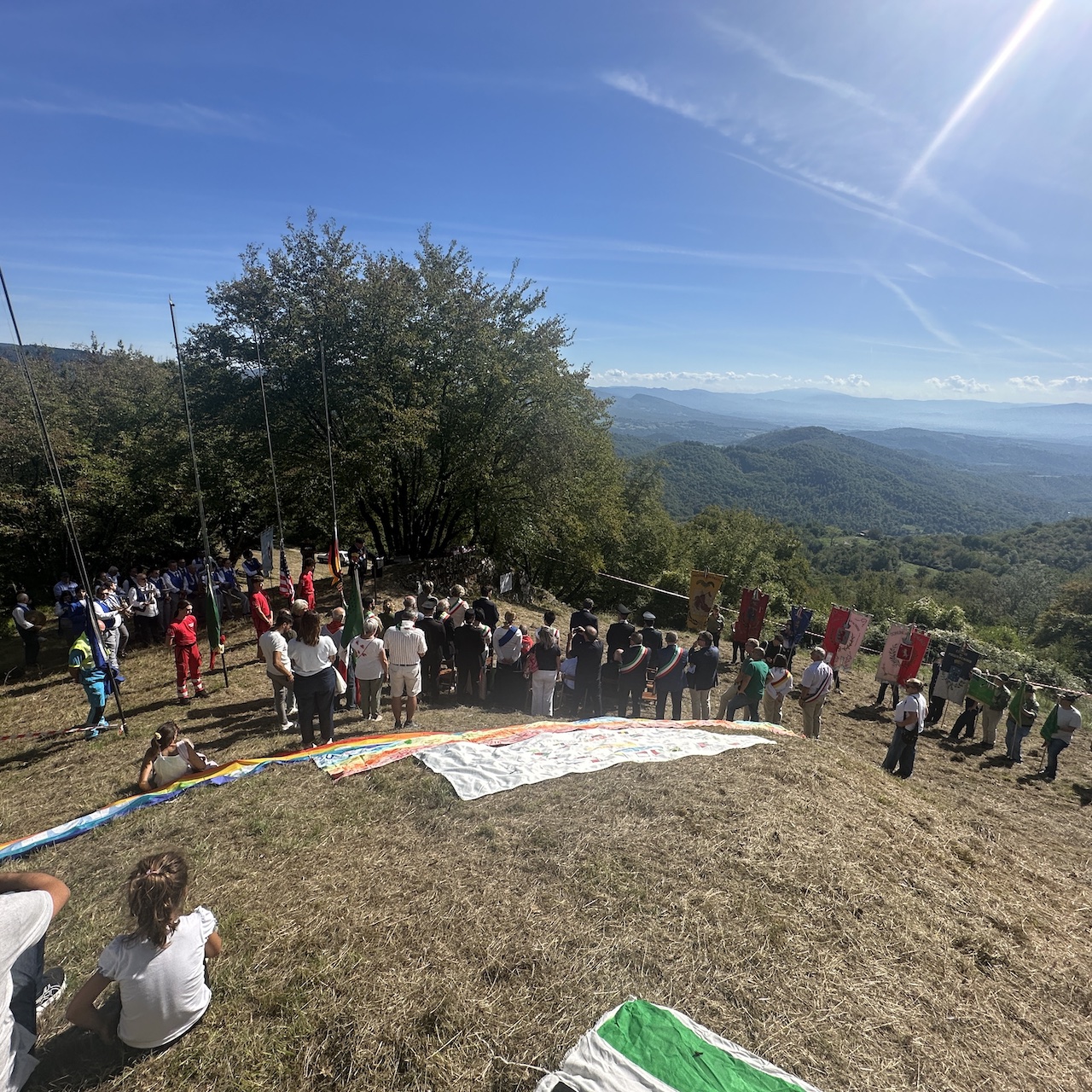 Anche il parco del Memoriale della Torricella ieri mattina è stato, per così dire, allestito con la coloratissima bandiera di 8 metri realizzata l’anno scorso dai bambini di Vernio. Alla cerimonia, che rappresenta il momento più evocativo dell’evento in ricordo della battaglia che avvenne proprio su questo crinale, organizzata dal Comune di Vernio in collaborazione con l’associazione Linea Gotica di Vernio, la Fondazione CDSE e l’ANPI Val di Bisenzio, hanno partecipato i 4 Comuni gemellati (Jettinge, Senones, Marchin e Celenza sul Trigno), l’ONUCI, gli Alpini di Montepiano e il CAI di Montepiano che ha guidato il trekking per raggiungere il luogo dell’evento.