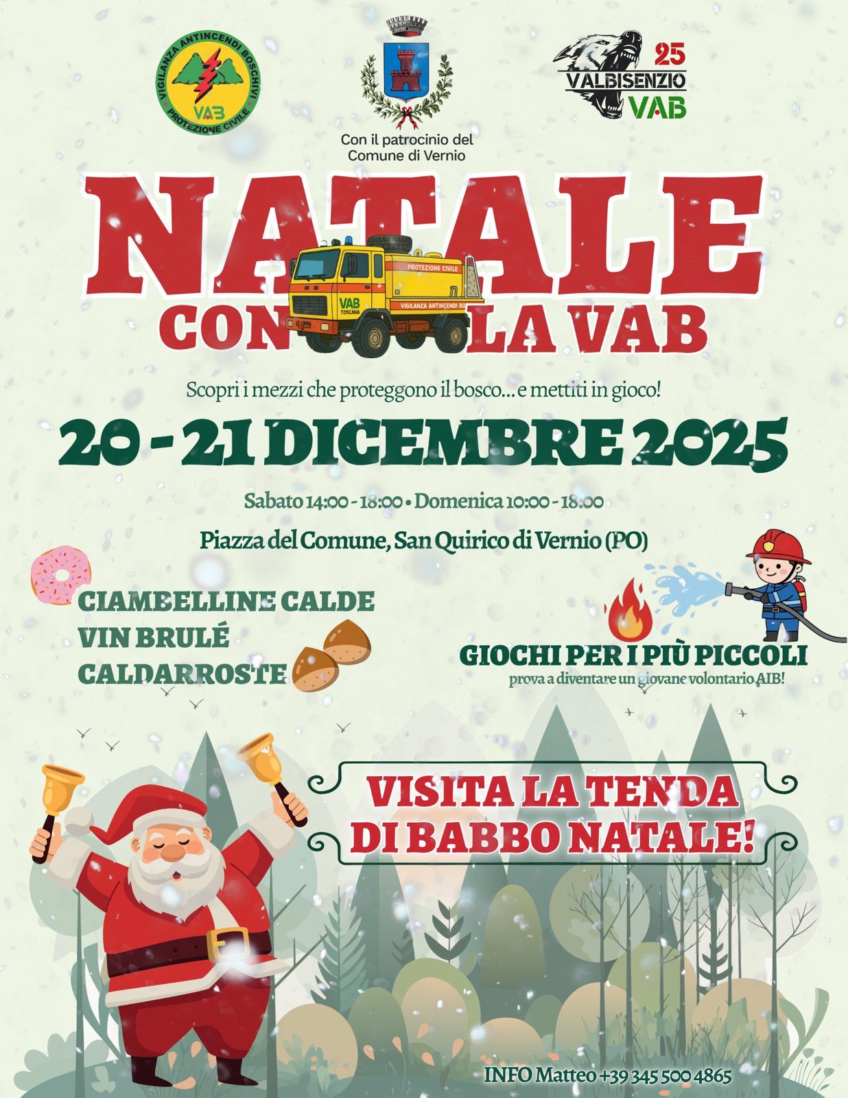 Sabato 20 dalle 14 alle 18 e domenica 21 dicembre dalle 10 alle 18, la piazza del Comune sarà animata dai mezzi e dai giochi per provare a diventare un giovane volontario VAB, grazie all’iniziativa “Natale con la VAB”, che ha il patrocinio del Comune di Vernio ed è inserita nel programma di eventi per le festività “Vernio sotto l’albero”.